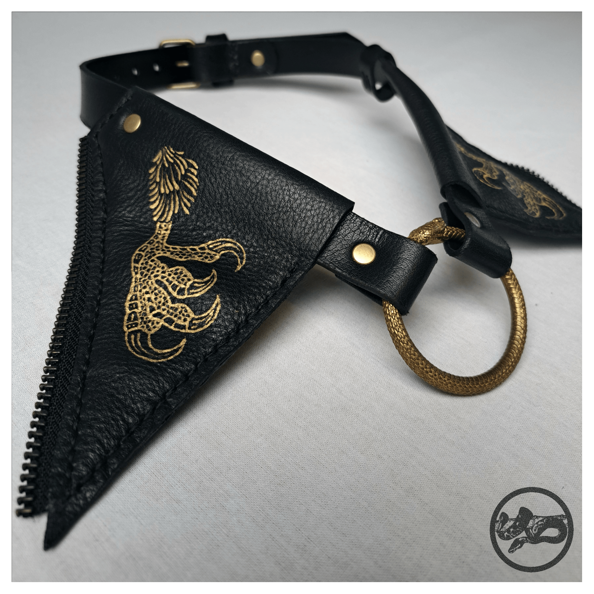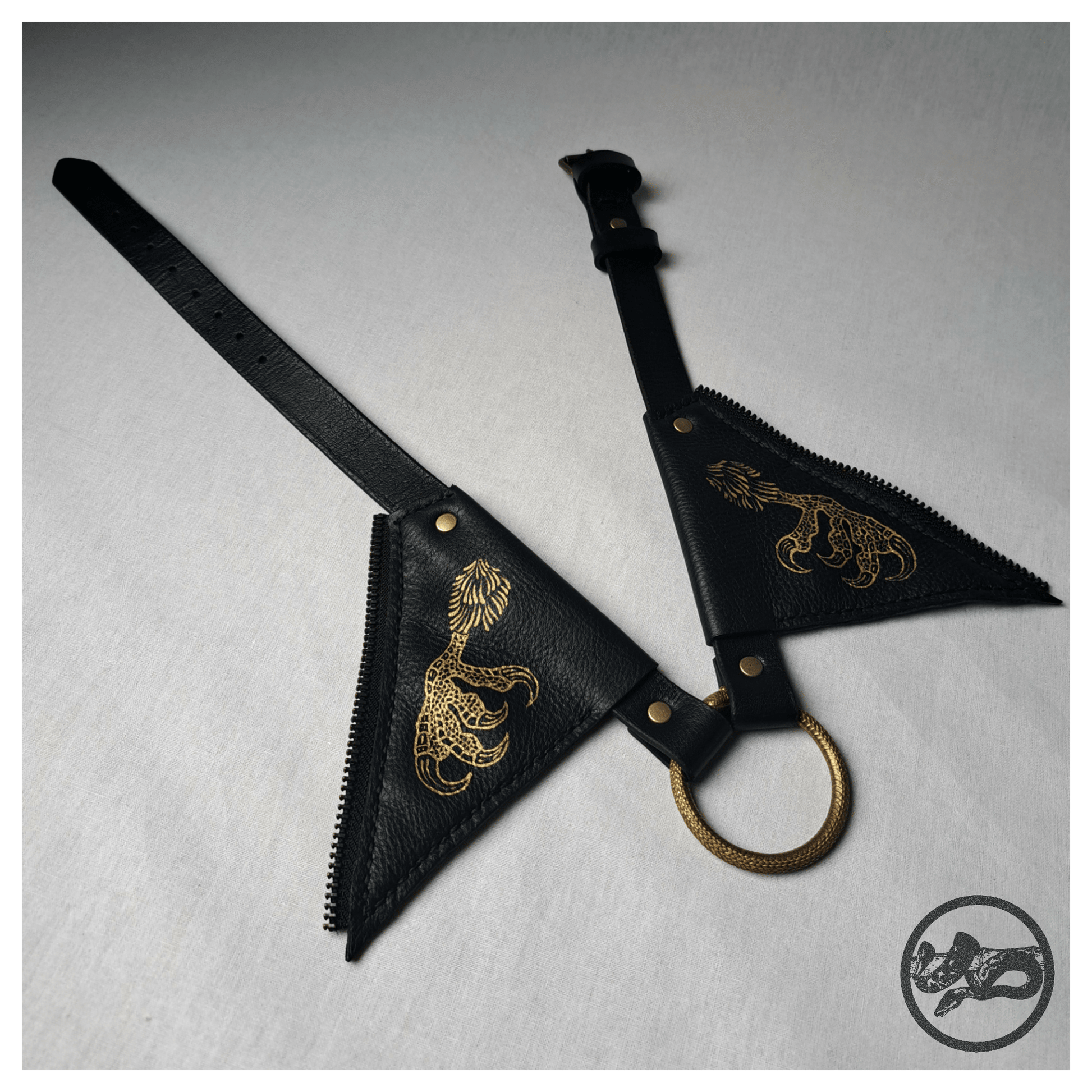 Genuine upcycled leather, brass hardware, golden leather paint.
