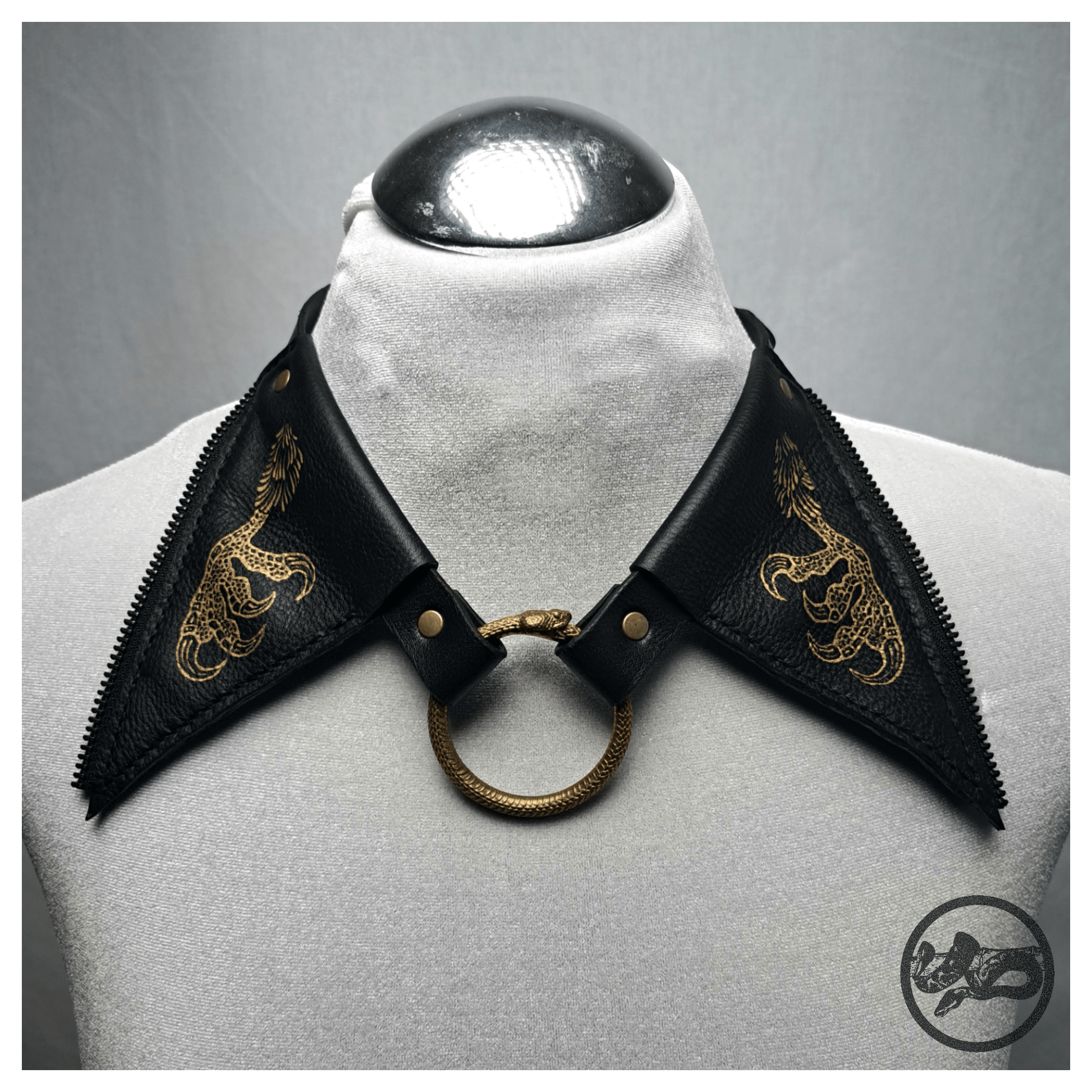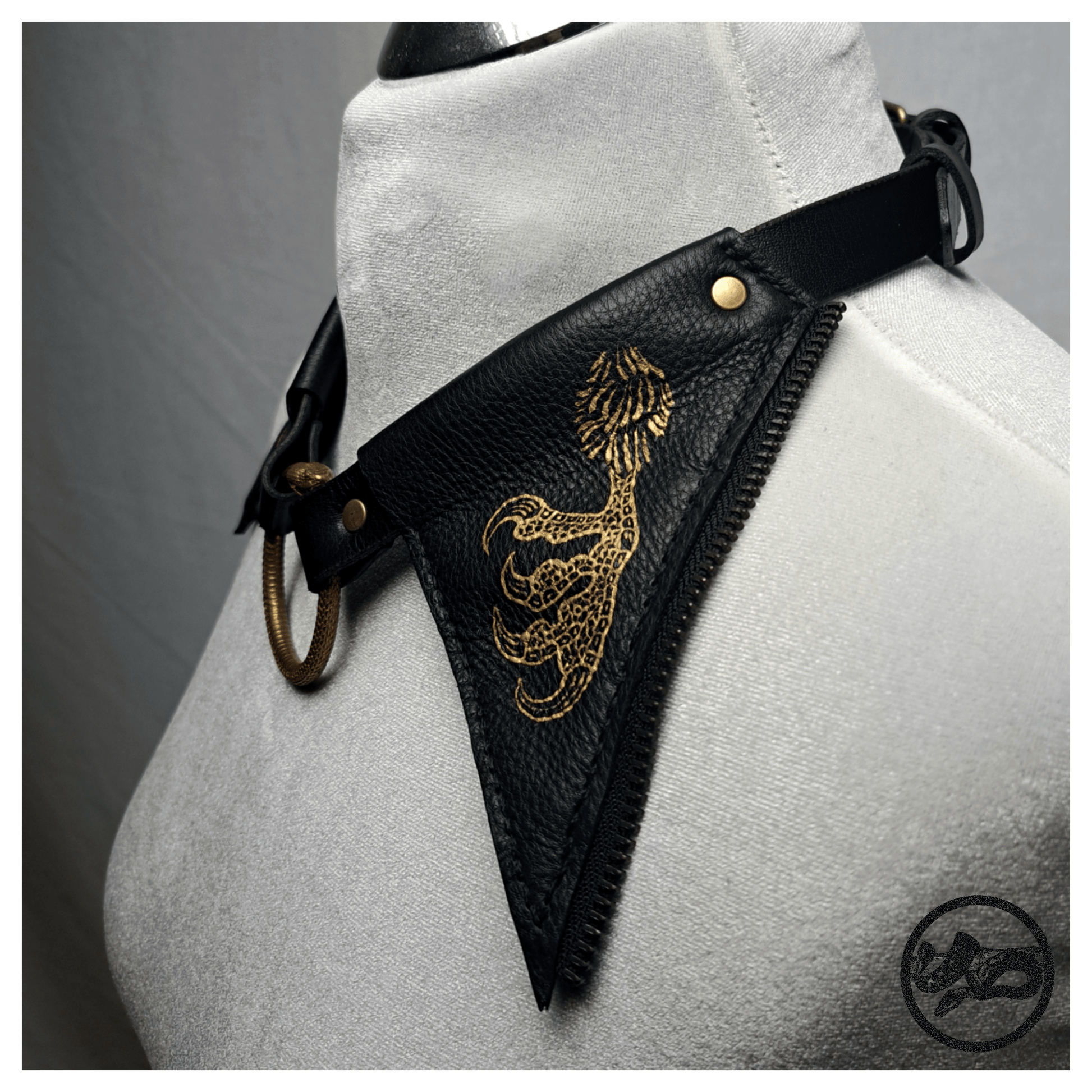 This collar is made from soft upcycled black leather and brass. The wings were cut out of motorcycle pants and were a bit of a challenge to paint on. But the more structured surface of the leather is just so pleasing to the eye.